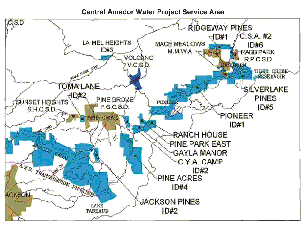 About CAWP (Central Amador Water Project)If you buy water from Amador Water Agency and live in one of the following communities: Sunset Heights, Jackson Pines, Pine Grove, Pine Acres, Ranch House Estates and vicinity, Pioneer, Rabb Park, Ridgeway Pines, Silver Lake Pines, Sierra Highlands, Fairway Pines or Mace Meadows, then your water comes from the Central Amador Water Project System (CAWP). CAWP water is pumped from the Tiger Creek Afterbay which is on the Mokelumne River. This water is pumped 1,200 feet up to the water treatment plant in Buckhorn. After treatment, the water is stored and then distributed to the above mentioned areas via the distribution piping system. |