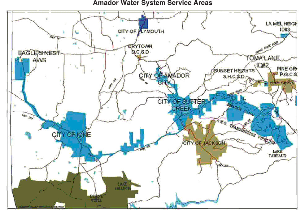 Amador Water System - Sutter Creek, Ione & Amador CityIf you have public water in Sutter Creek, Ione or Amador City, then you buy your water from the Amador Water Agency (AWA). The AWA maintains all of the water lines that distribute water throughout your town and is responsible for water treatment, water quality monitoring, reading your meter, and sending you the monthly bills. Amador Water System (AWS) is the system within AWA that is responsible for water that goes to Jackson, Ione, Sutter Creek, Plymouth, Drytown, Amador City and Martell. This system also serves untreated water from the Amador Canal to customers between Lake Tabeaud and Sutter Hill. AWS transports the raw water from lake Tabeaud via the Amador Transmission Line to Sutter Hill. At Sutter Hill, some of the water is treated and stored for distribution to Jackson, Sutter Creek, Plymouth, Drytown, Amador City and Martell. Untreated water is piped from Sutter Hill to Ione and then treated for use in Ione. |