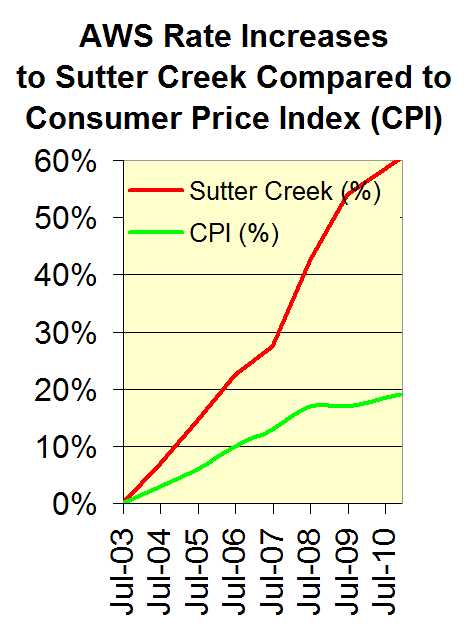 How Ratepayers are AffectedIf AWS does not operate efficiently, costs to ratepayers will be excessive. Since 2004, AWS rates to Jackson have increased by 87%. The increase is mostly due to the cost of design, planning and construction of the Amador Transmission Line (ATL) that was completed in 2007. The ATL is built to supply three times the capacity that is needed on the system today. Because the project was overbuilt, ratepayers are paying for a project that is three times larger than needed. Ratepayers would save over $1,000,000 per year if the cost of the ATL was split fairly between them and future customers. $1,000,000/year amounts to about a 20% reduction in water rates needed on the AWS. AWS ratepayers are also affected by special deals for selected developers. The infrastructure needed to treat and deliver water is very expensive and has been paid for by ratepayers. Ratepayers pay for the extra capacity that is built into most improvements with the expectation that new development will reimburse the ratepayers for the capacity they invested in. Unfortunately, the AWA board can (and does) sell the infrastructure for as little as half of what it is worth. Recently, the AWA Board gave a $500,000 discount to JTS Communities, Inc. (Castle Oaks in Ione) on connection fees. $500,000 amounts to over 10% of the annual cost of water on AWS. |